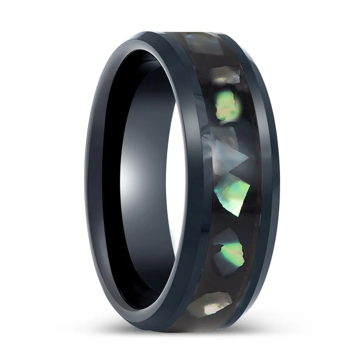 Black Tungsten Ring with Black Resin & Abalone Shell Inlay - Beveled Edge, 8mm Comfort Fit
