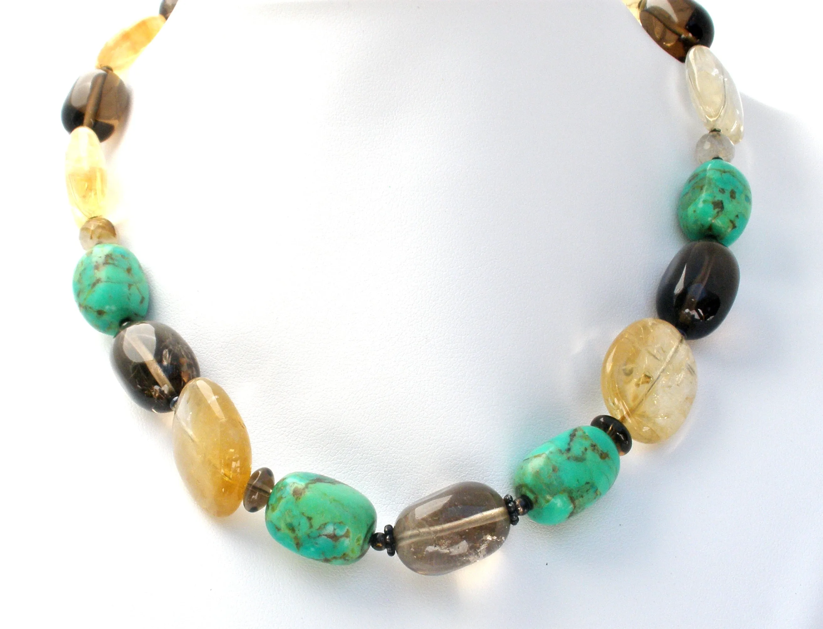 Southwestern Beaded Jewelry - This is a sterling silver multi color gemstone bead necklace with blue turquoise and brown smoky quartz.