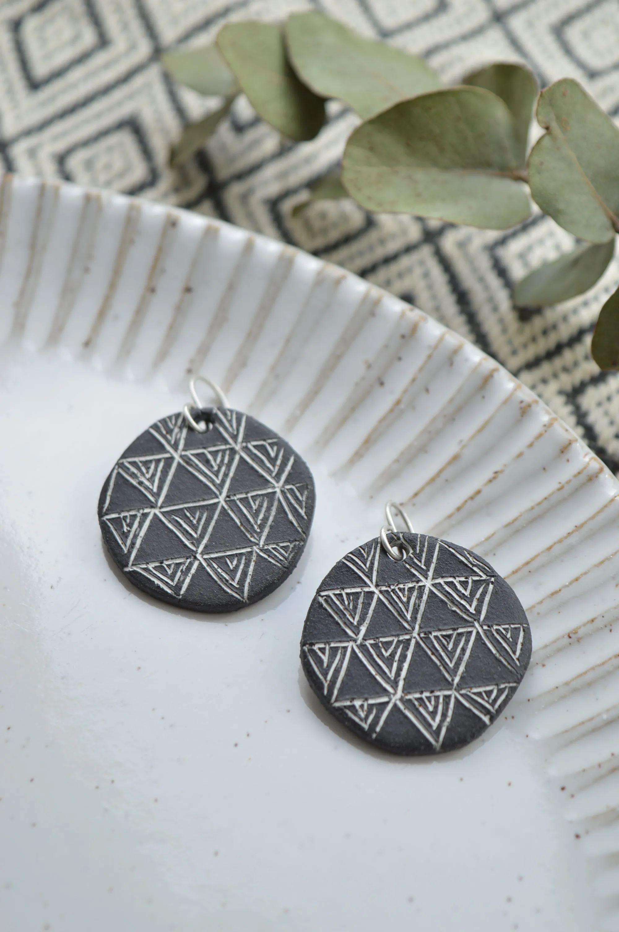 A pair of ceramic statement earrings in black with white geometric pattern. Modern organic shape. Comfortable and lightweight to wear. Matte finish.