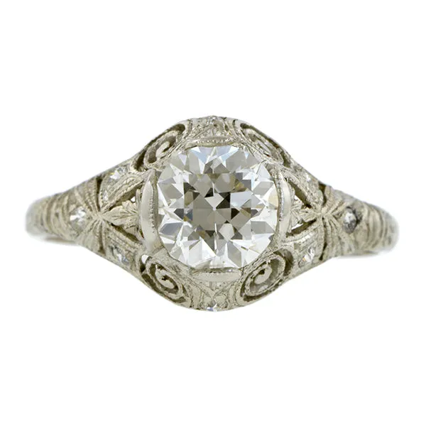 Featuring a Transitional Round Brilliant cut (Circular Brilliant) diamond weighing app. 0.98ct. (H color, SI1 clarity) in a filigree mount with swirl detail set with eight Old European cut diamonds weighing app. 0.08ctw., fashioned in platinum. Circa 1915. GIA 2175299528. Size 6.5.