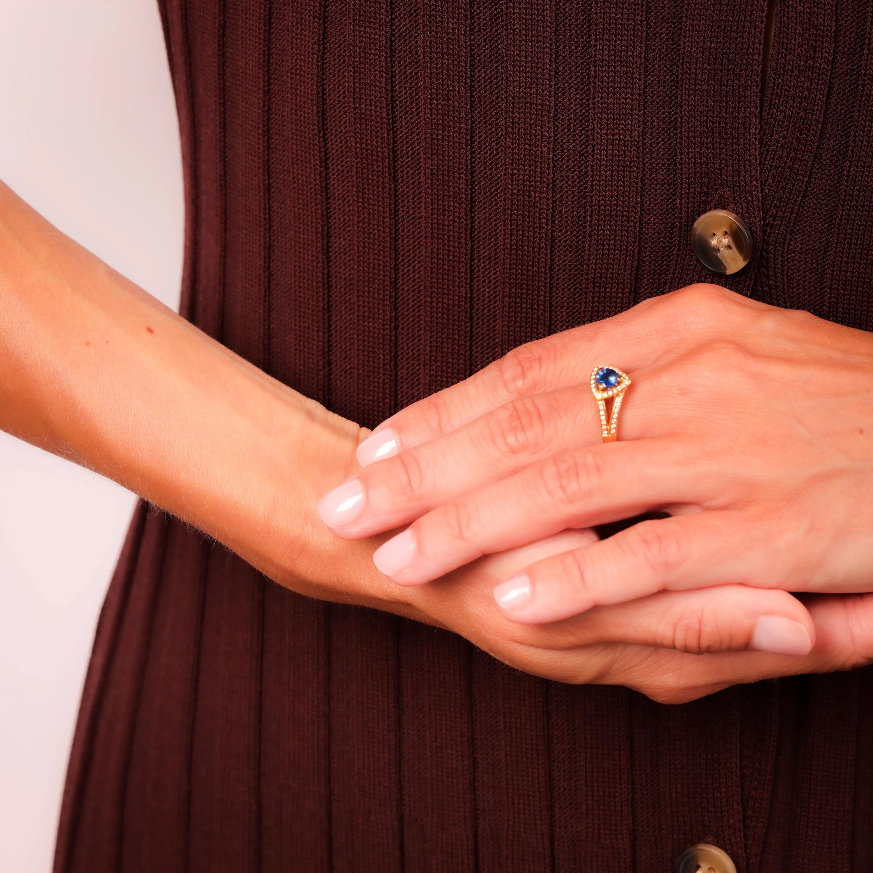 This exquisite "Dream and Love" ring by Mauboussin, crafted in the 2010s, showcases a stunning 0.50-carat round brilliant cut blue sapphire at its center, radiating with deep, captivating color. Surrounding the sapphire are 51 sparkling round brilliant cut diamonds, totaling approximately 0.20 carats, with exceptional F color and VS clarity. Set in rich 18K yellow gold and signed, numbered, and hallmarked with purity marks, this 5.57-gram ring is a beautiful expression of modern luxury and timeless elegance, perfect for making a statement of love and sophistication.