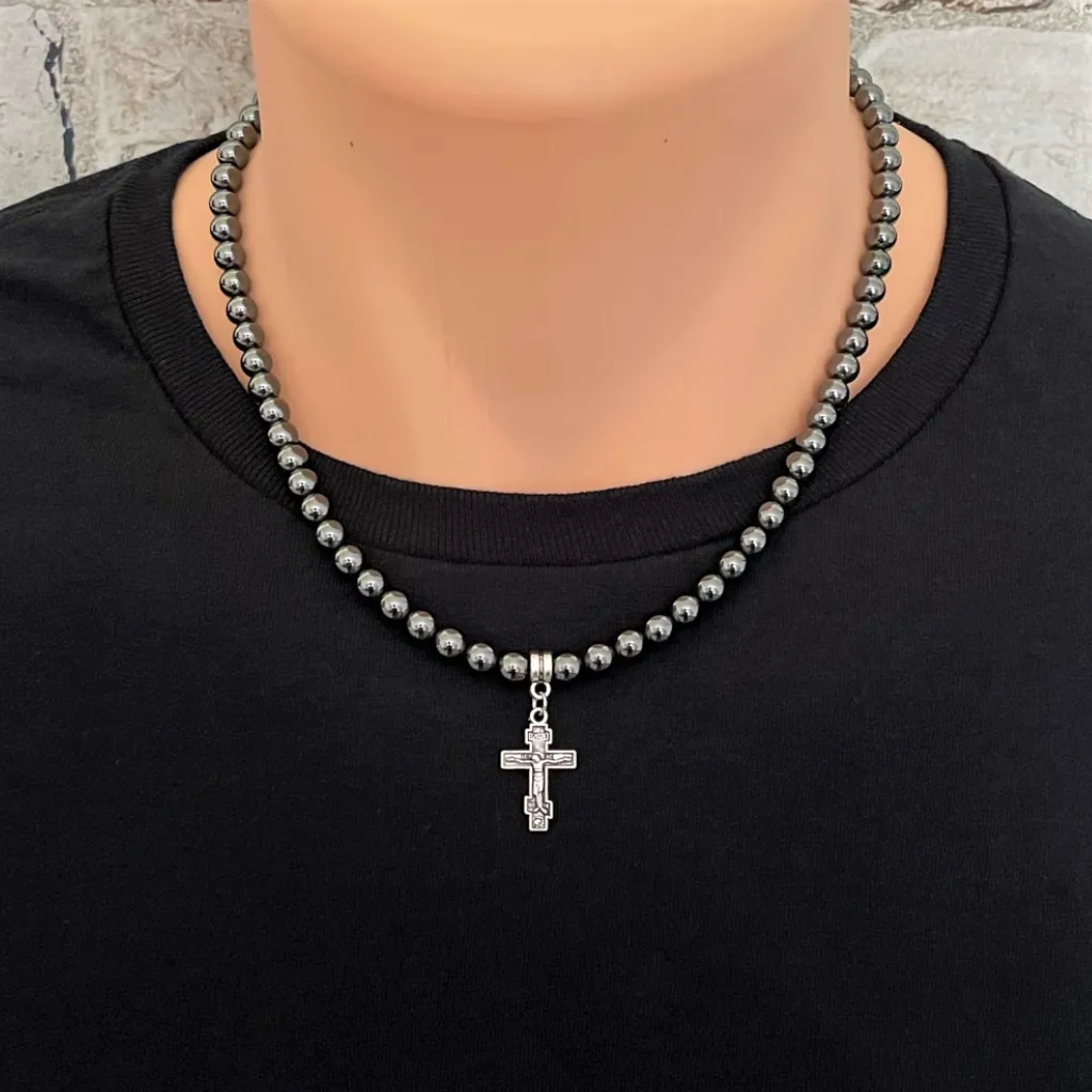 Mens Hematite and Silver Cross 6mm Beaded Necklace