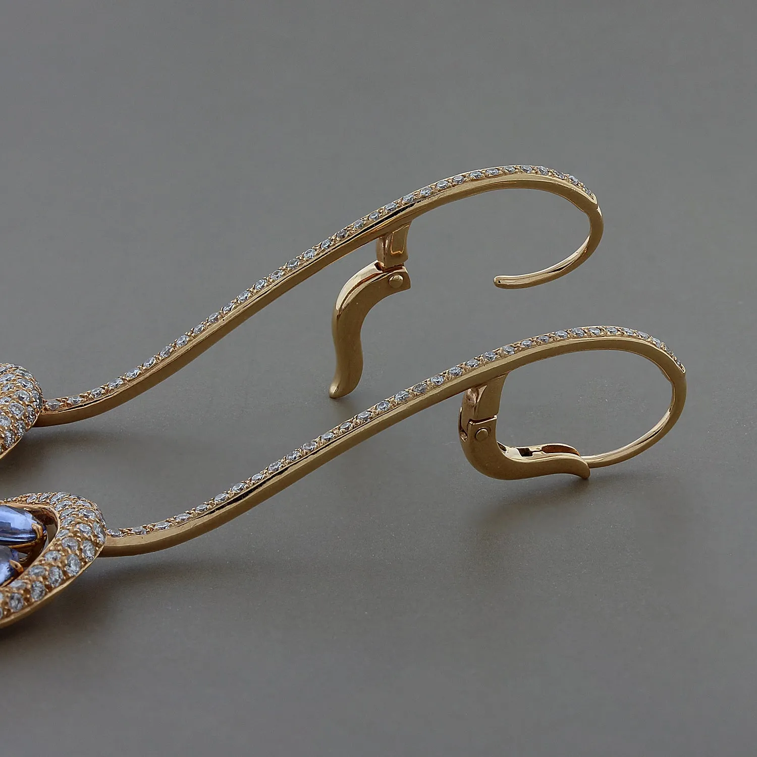 A spectacular styled and crafted pair of designer earrings. They feature 19.71 carats of rose cut blue sapphire which are prong set in 18K rose gold. There are 3.42 carats of round cut white diamond that are set around the blue sapphire and along the top of the earrings. A truly special piece of jewelry for a special woman.