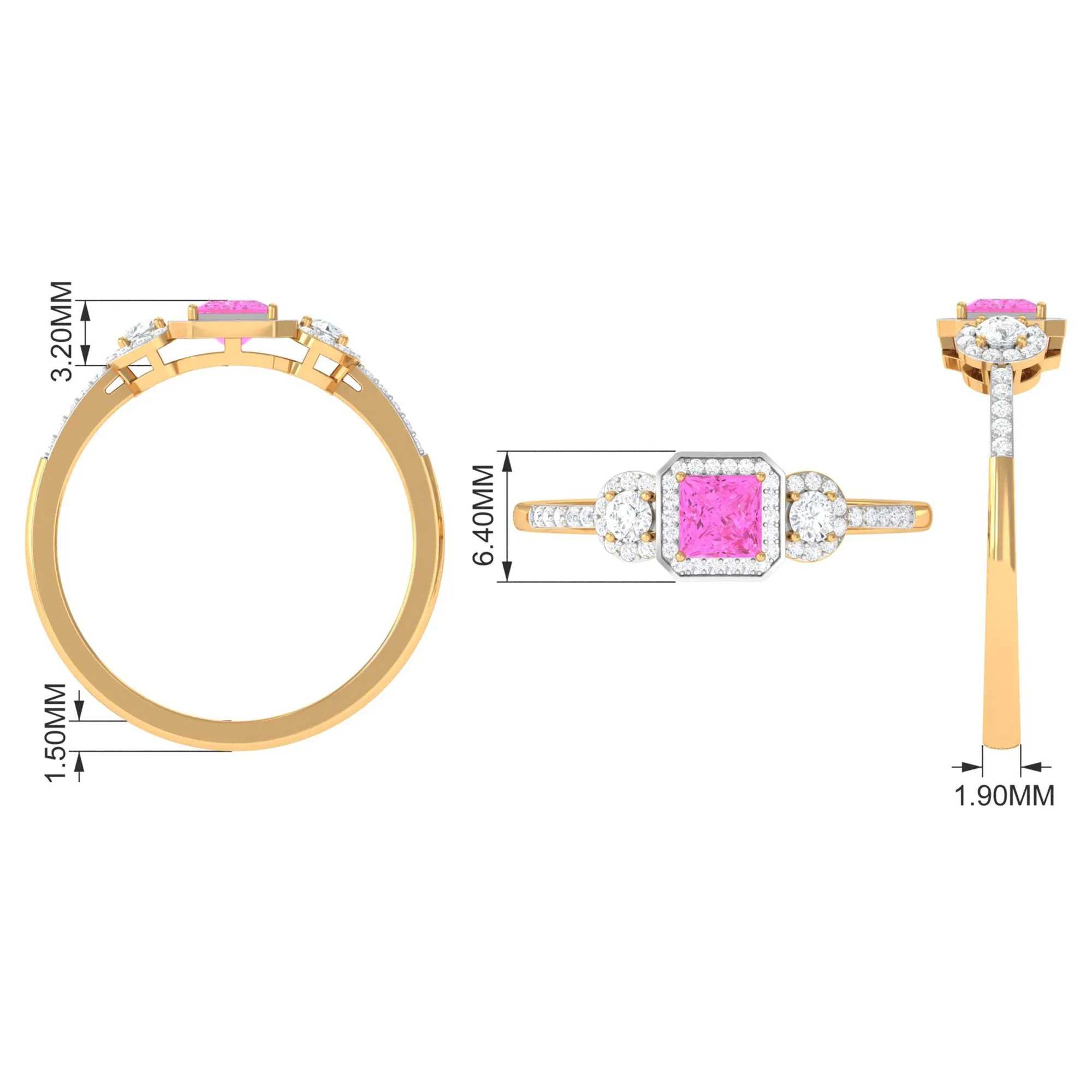 Make a statement with this Engagement Ring. The dazzling Princess Cut Pink Sapphire is accentuated by a halo of brilliant Diamond gemstones.