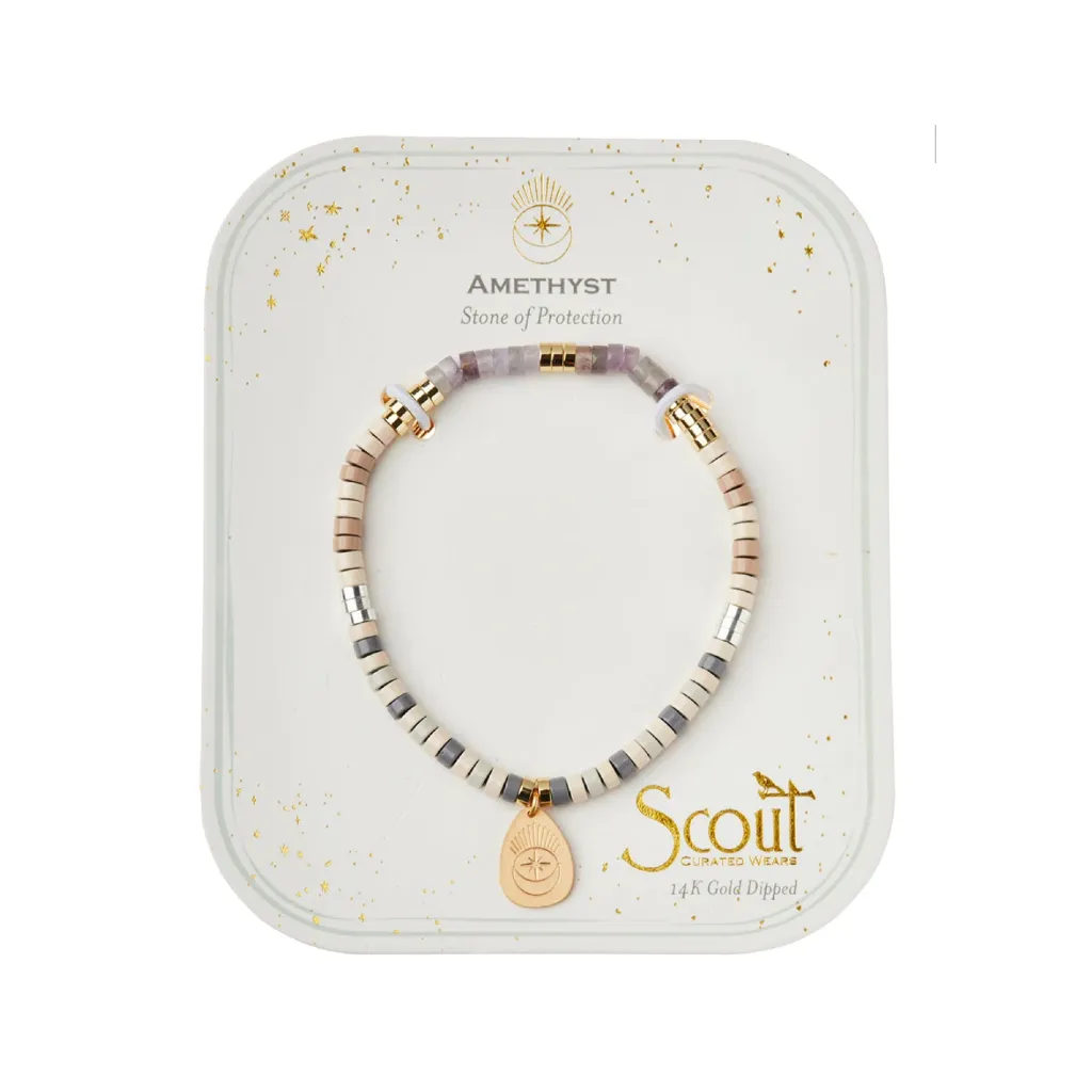 Semi precious stones with positive properties and enamel beads encircle an icon charm engraved with a positive intention. Made of real semi-precious stone beads and enamel beads with a gold dipped or sterling silver dipped charm. Every charm is engraved with an icon that reflects the stone’s properties.